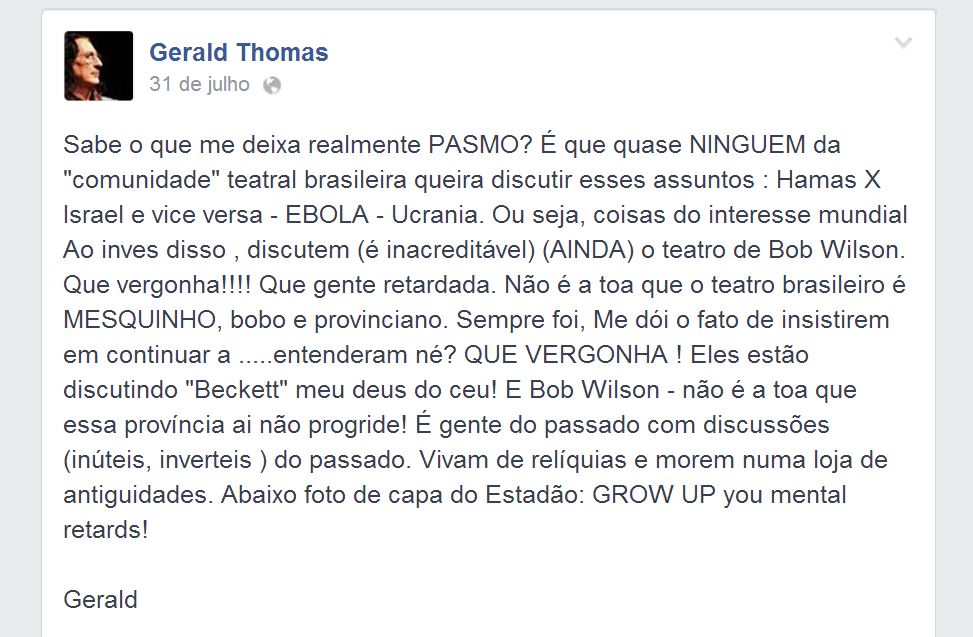 Um resumo da história: Em 31 de julho, Thomas escreveu no seu perfil: “Sabe o que me deixa realmente pasmo? É que quase ninguém da “comunidade” teatral brasileira queira discutir esses assuntos : Hamas X Israel e vice versa – Ebola – Ucrania. Ou seja, coisas do interesse mundial Ao inves disso , discutem (é inacreditável) (ainda) o teatro de Bob Wilson. Que vergonha!!!! Que gente retardada. Não é a toa que o teatro brasileiro é mesquinho, bobo e provinciano.” (e continua). Veja: