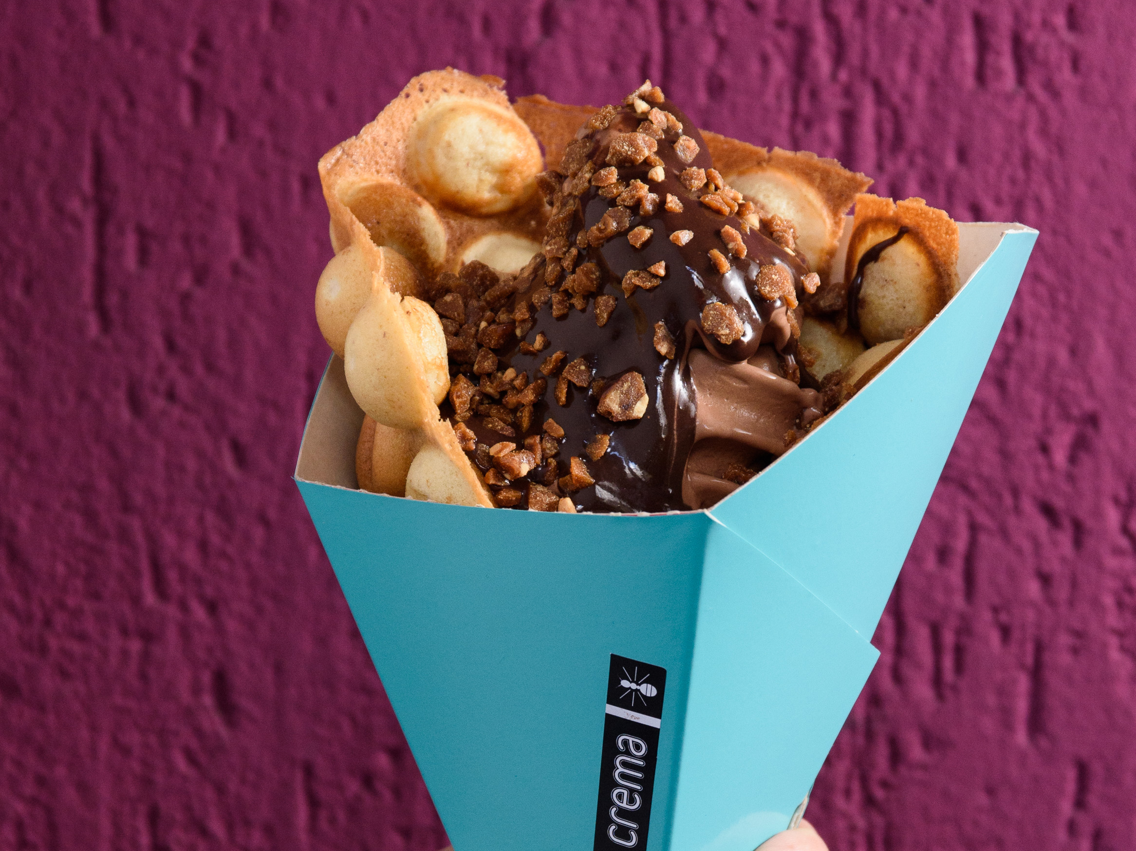 Agora, Carole traz uma novidade de nome inglês: bubble wrap waffle, sucesso nas ruas de Londres. Para simplificar, é um cone de waffle com bolhas na superfície da massa. Esse panquecão, quentinho e assado na hora, pode ter massa clássica baunilha e canela ou de amêndoa.