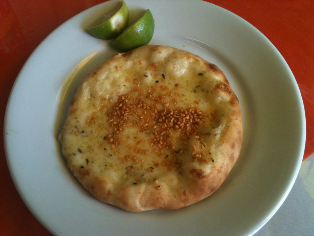 Primeiro, pedi uma esfiha aberta de queijo mussarela com alho: