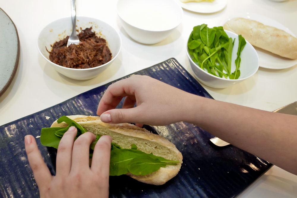 Abra a baguete, disponha algumas folhas de rúcula e acrescente um pouco da carne. Por cima, coloque o creme de mandioca.