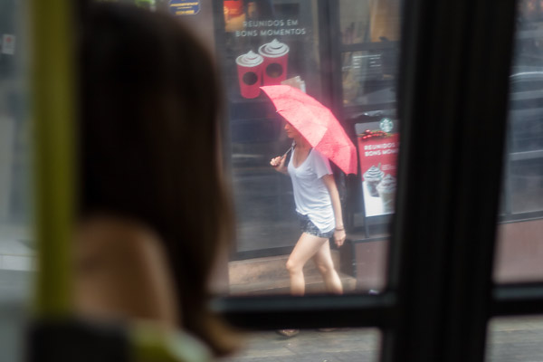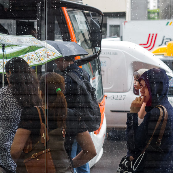 Hoje a cidade está seca de novo. Mas houve uma tarde de chuva que lavou o ar e reanimou a vida. Eis o resultado de meia hora de flagrantes a bordo de ônibus e em seus pontos na Av. Paulista e Rua Augusta. Descrições adicionais não se fazem necessárias.