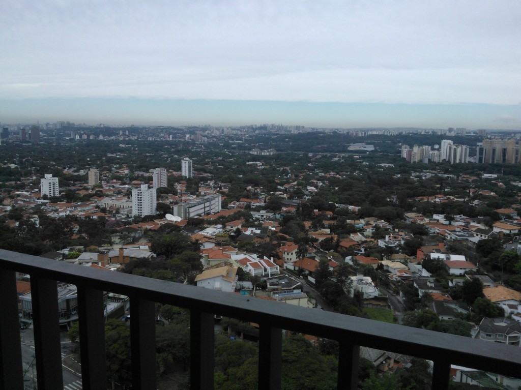 Sala ampla com janelas percorrendo uma parede inteira. Dá para ver o Pico do Jaraguá