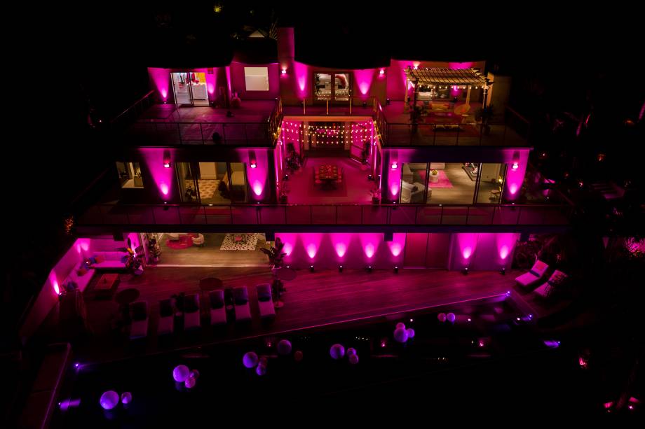 São dois quartos e dois banheiros, com toques de pink em todos os cômodos. A locação tem piscina de borda infinita, cinema privativo, estúdio, quadra de esportes e espaço para refeições ao ar livre.