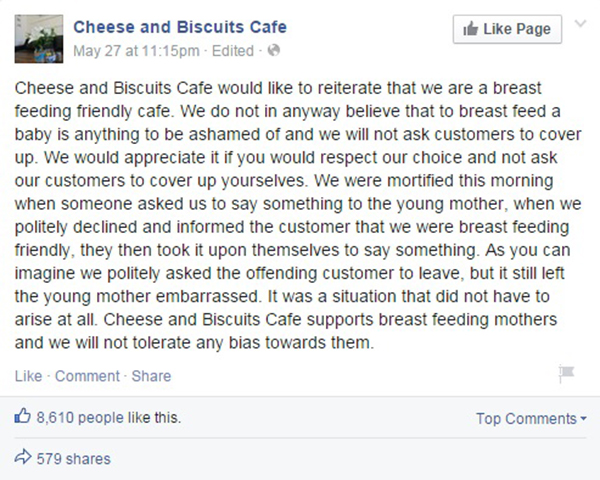 Após o acontecido, o Cheese and Biscuits Cafe (como chama o estabelecimento de Jessica) publicou uma nota em sua página no Facebook: “Nós apoiamos a amamentação. Nós acreditamos que alimentar um bebê não é motivo de vergonha e nós não vamos pedir aos nossos clientes que se cubram. Agradecemos se os nossos clientes respeitassem a nossa escolha ao não pedirem para outros clientes se cobrirem“, o comunicado informa.