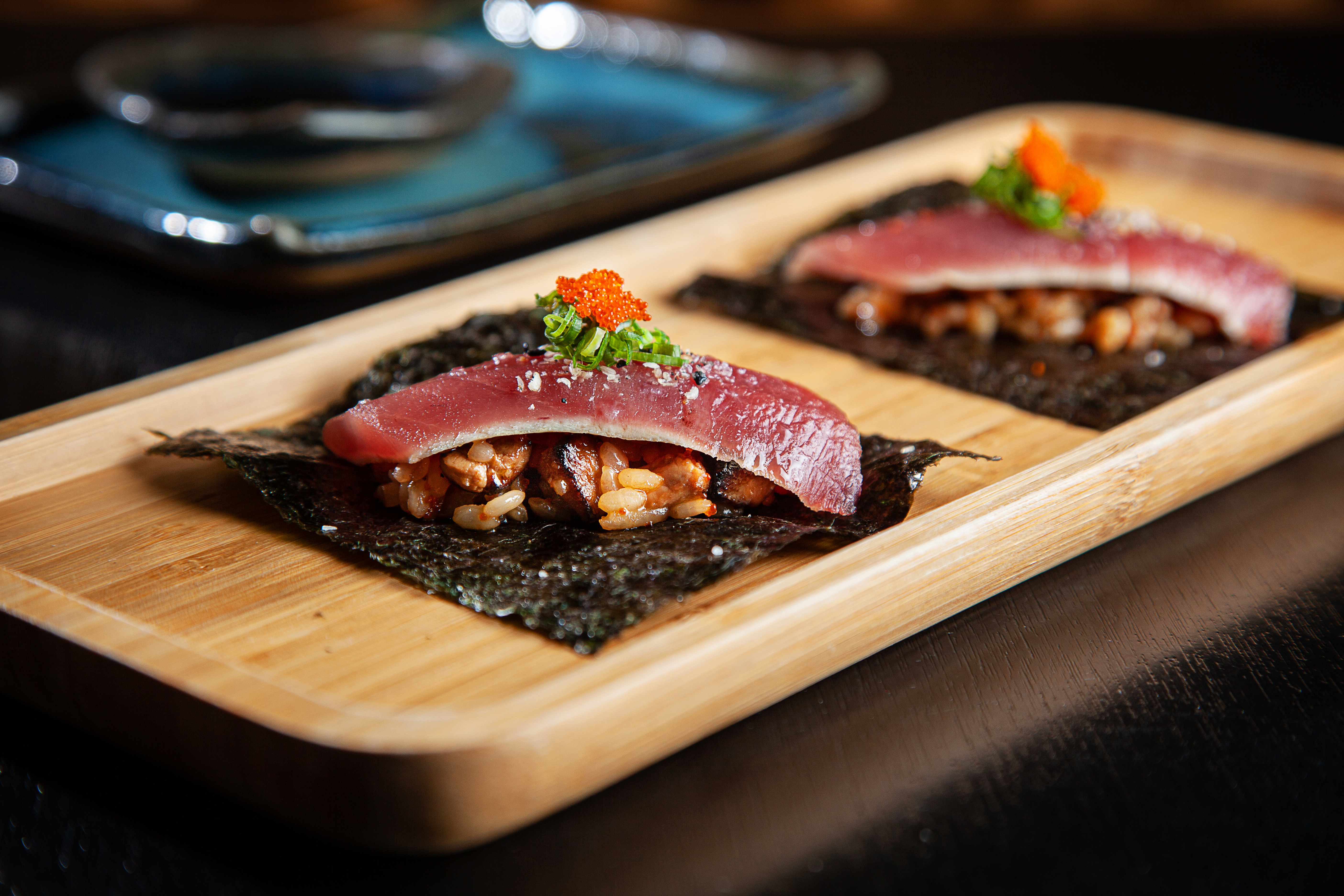 Além do fígado de pato rico em gordura misturado ao arroz, vem coberto com atum maçaricado, azeite, ovas de massagô e gergelim, tudo sobre uma folha de alga crocante.